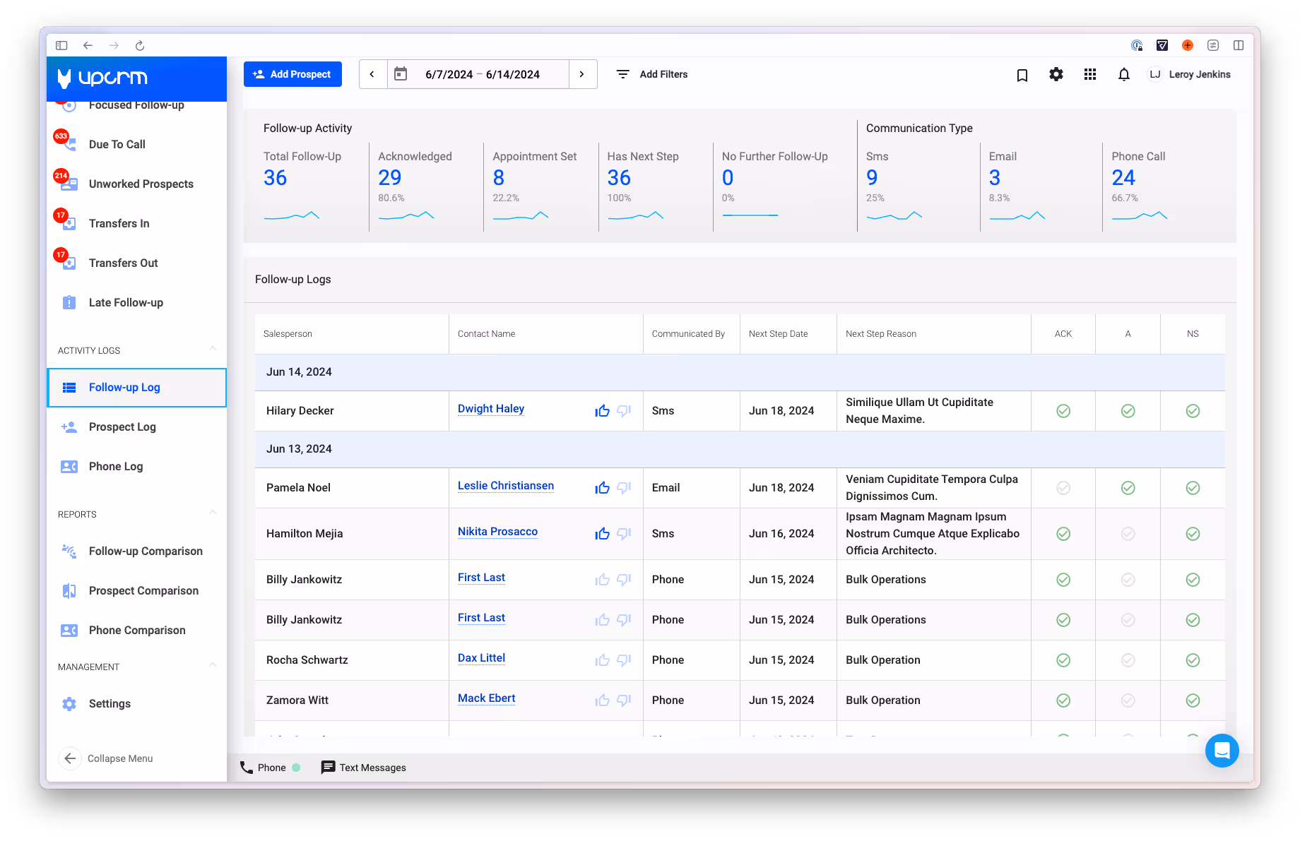 The Activity Logs in UpCRM are a great resource for Managers and Sales users to see what they have accomplished over a period of time. The logs found here are the Follow-up Log, Prospect Log, and Phone Log. The following documentation covers each log respectively.